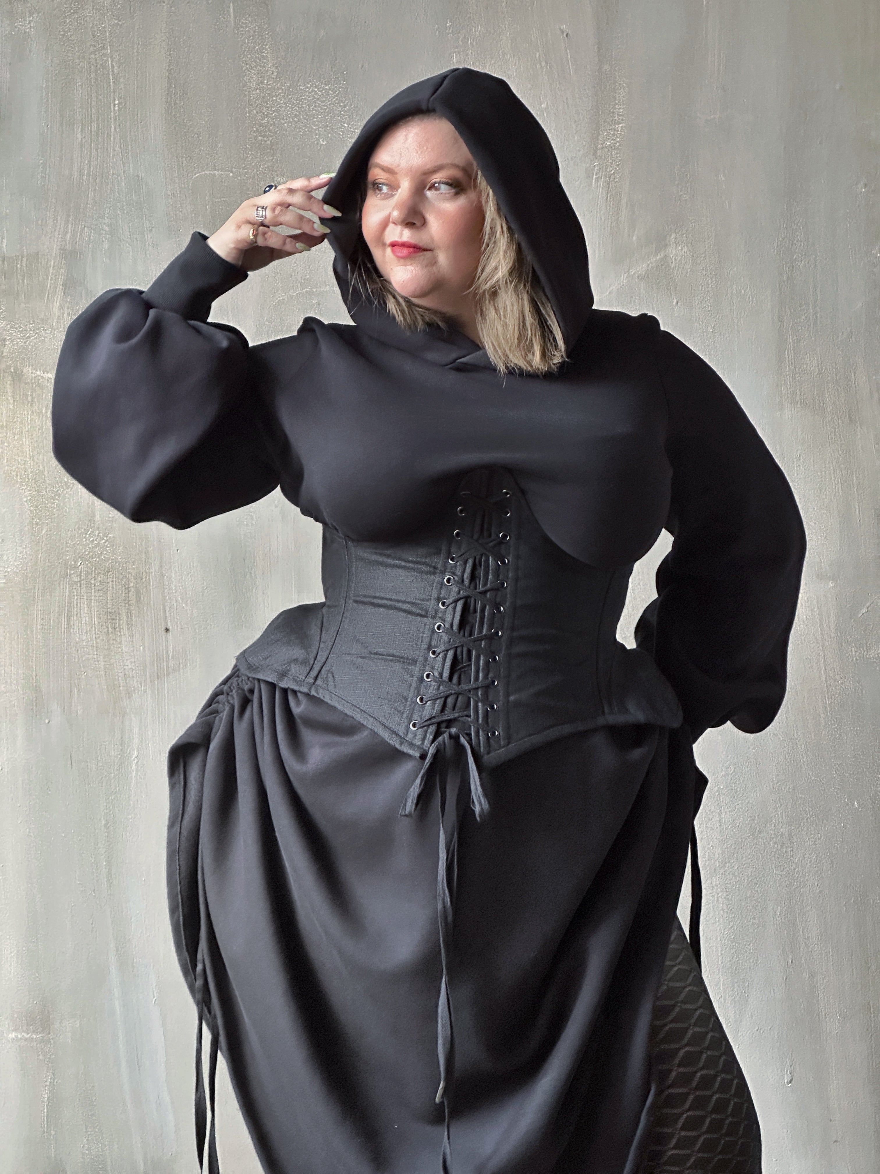 Our double laced underbust corset with exaggerated hip panniers is back and adjusted to fit our standard 5-size run. This piece is designed to have 1-2" of room in the centre front or back lacing. Easy to lace up on your own, with front access.