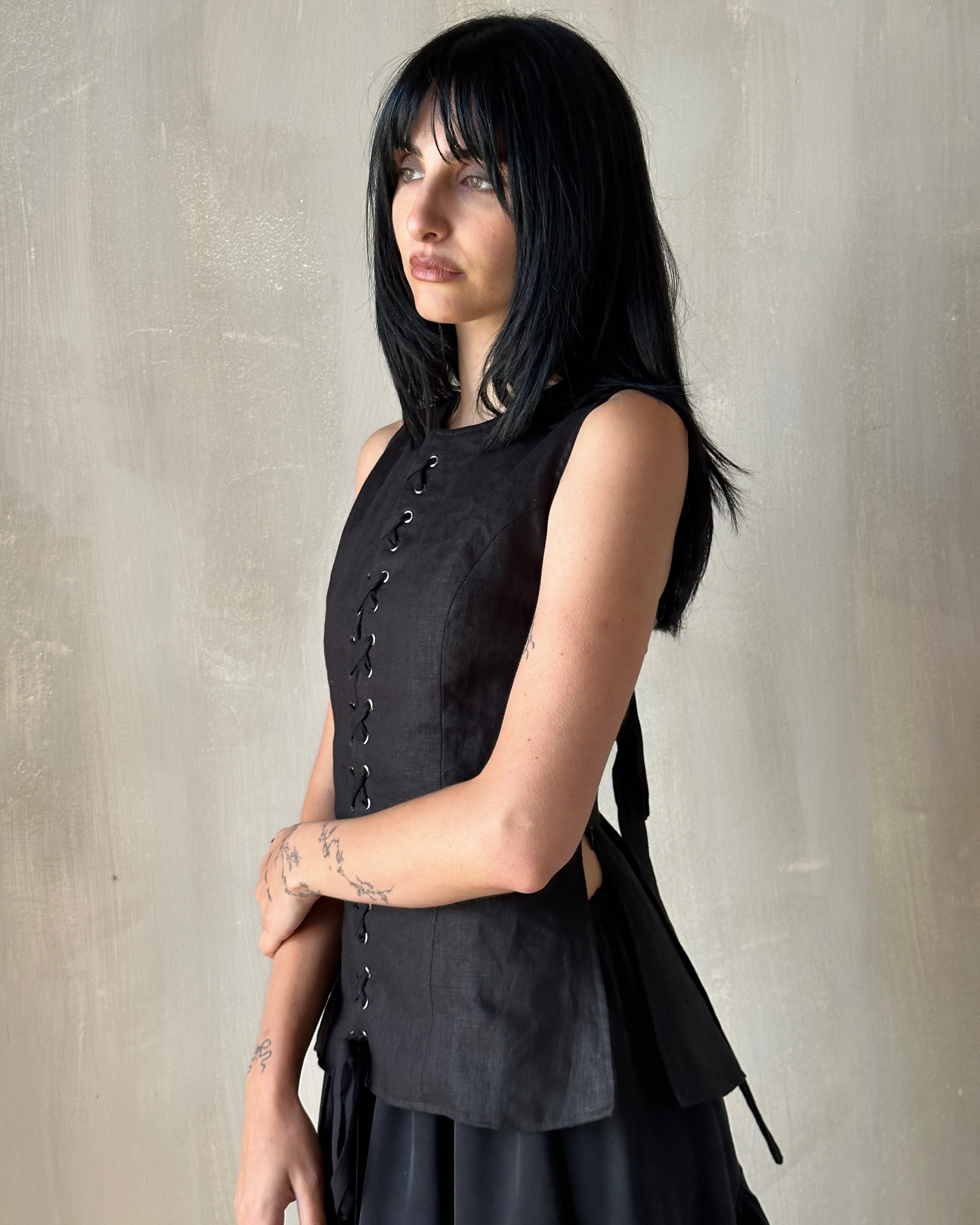 A fitted linen vest with gun metal eyelets and lacing up the center front. Side vents to waist for hip comfort, and an invisible side zipper for easy on and off.